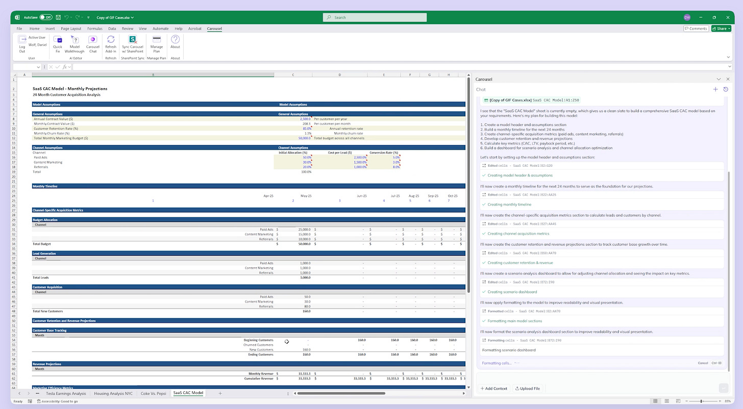 Carousel은 말 그대로 엑셀을 위한 AI 코파일럿입니다. 엑셀 플러그인 형태의 소프트웨어로, 채팅 창에 원하는 작업을 ChatGPT와 소통하듯이 입력하면 그대로 엑셀 시트 위에 구현해줍니다.