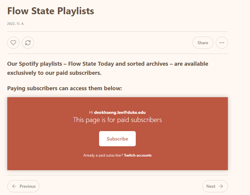 Flow State는 Public Domain Movies와 유사한데, 엄선한 음악들을 구독자들에게 보내준다. 이들은 독특하게도 유료 구독자들에게만 자신들의 스포티파이 플레이리스트를 공개하고 있다. 또 다른 Substack의 창의적 용법 중 하나.
