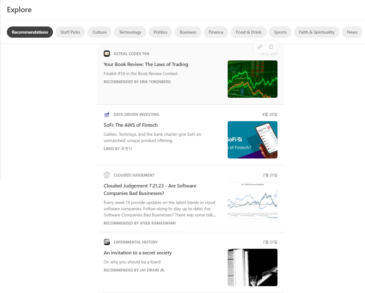 지난주에도 이야기한 바가 있지만, 현재의 Substack은 롱폼 텍스트 컨텐츠를 위한 유튜브2와도 같다. 이러한 비유를 뒷받침하는 가장 큰 근거는 최근 들어 정말 퀄리티가 좋아진 Substack의 탐색(Explore) 기능이다. 이제 독자들은 Substack을 이용해 단순히 자신이 구독하는 작가의 글을 받아볼 수 있을 뿐만 아니라, 그 존재를 몰랐지만 자신이 좋아할만한 스타일의 글을 쓰는 작가들을 새로 추천받을 수 있다3.