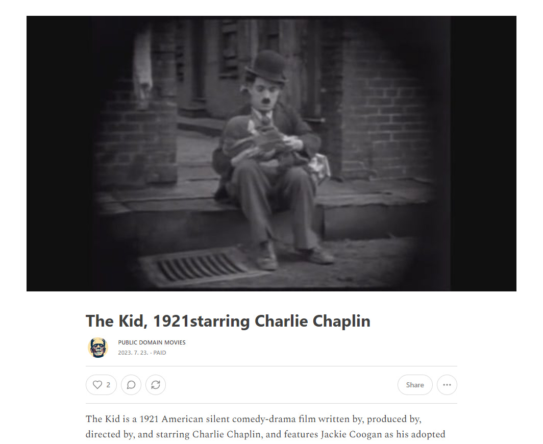Public Domain Movies는 저작권이 대중에 풀려 공공재가 된 영화를 짤막한 해설과 함께 독자들에게 보내준다. Substack이 엔터테인먼트의 영역까지 진출할 수도 있음을 시사한다.