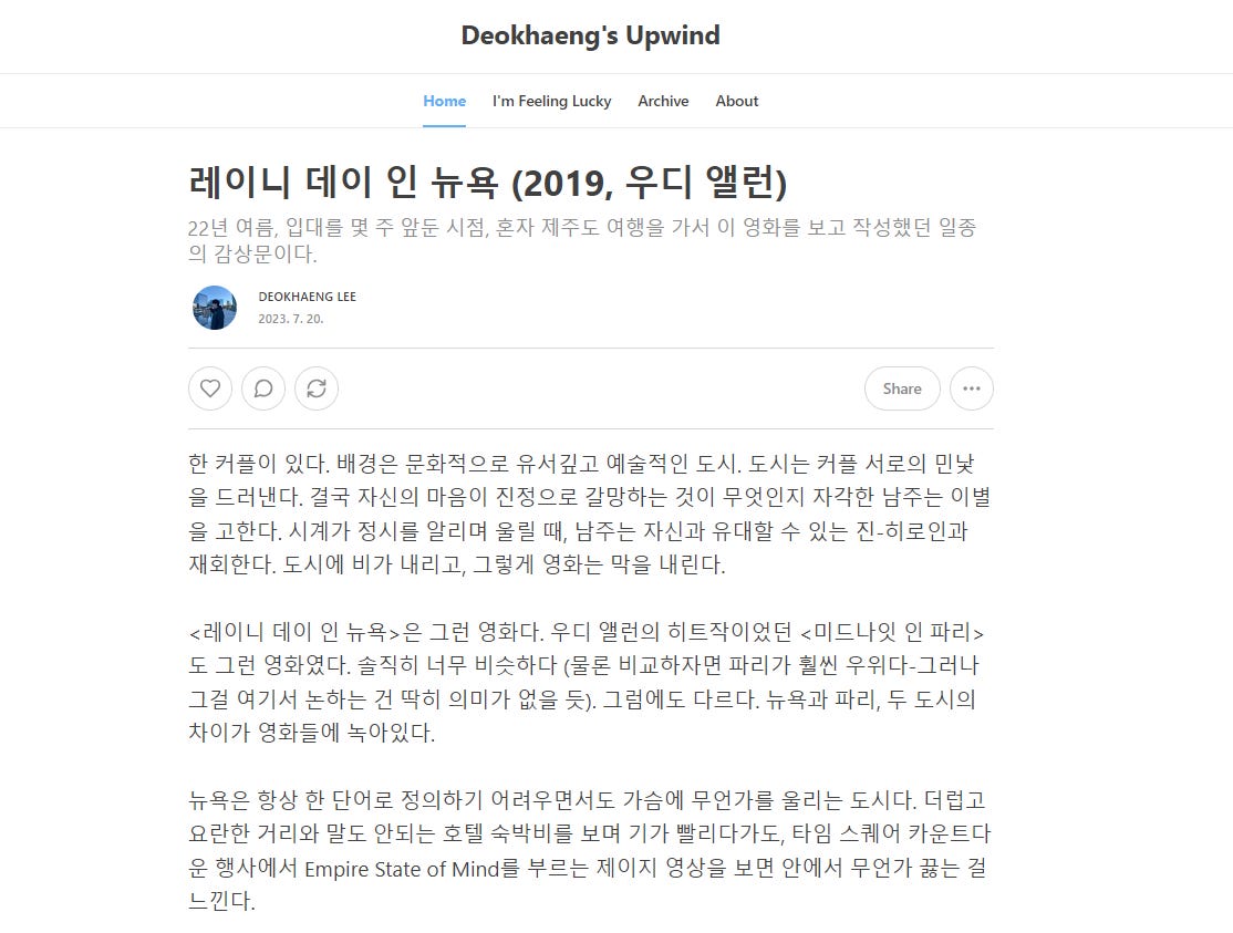 각각의 뉴스레터가 온전한 자신만의 웹사이트를 가지고 있다는 것은, 우연히 그 뉴스레터의 글을 접하게 된 방문자가 충분한 시간을 가지고 뉴스레터의 다른 글들도 둘러보며 그 뉴스레터 작가의 포괄적인 생각과 아이덴티티에 공감할 수 있음을 뜻한다. 누군가의 프로필을 구경하다가도 몇 분 안지나 For-You-Page로 넘어가 또다시 알고리즘이 제안하는 영상들의 바다로 빠져들게 되는 틱톡과 본질적으로 다른 점이다.