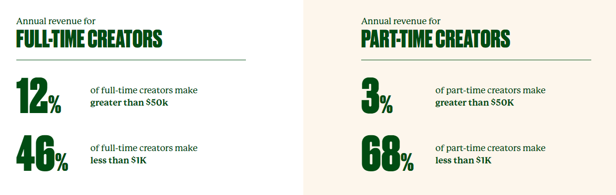 둘째로, 빈부격차의 문제. 아무리 과거에 비해 많은 사람들이 크리에이터에 도전하고 있다지만 이들 중 90% 이상은 성공을 거두고 있지 못하다. 이를 잘 보여주는 것이 링크트리에서 22년에 발간한 크리에이터 리포트다.