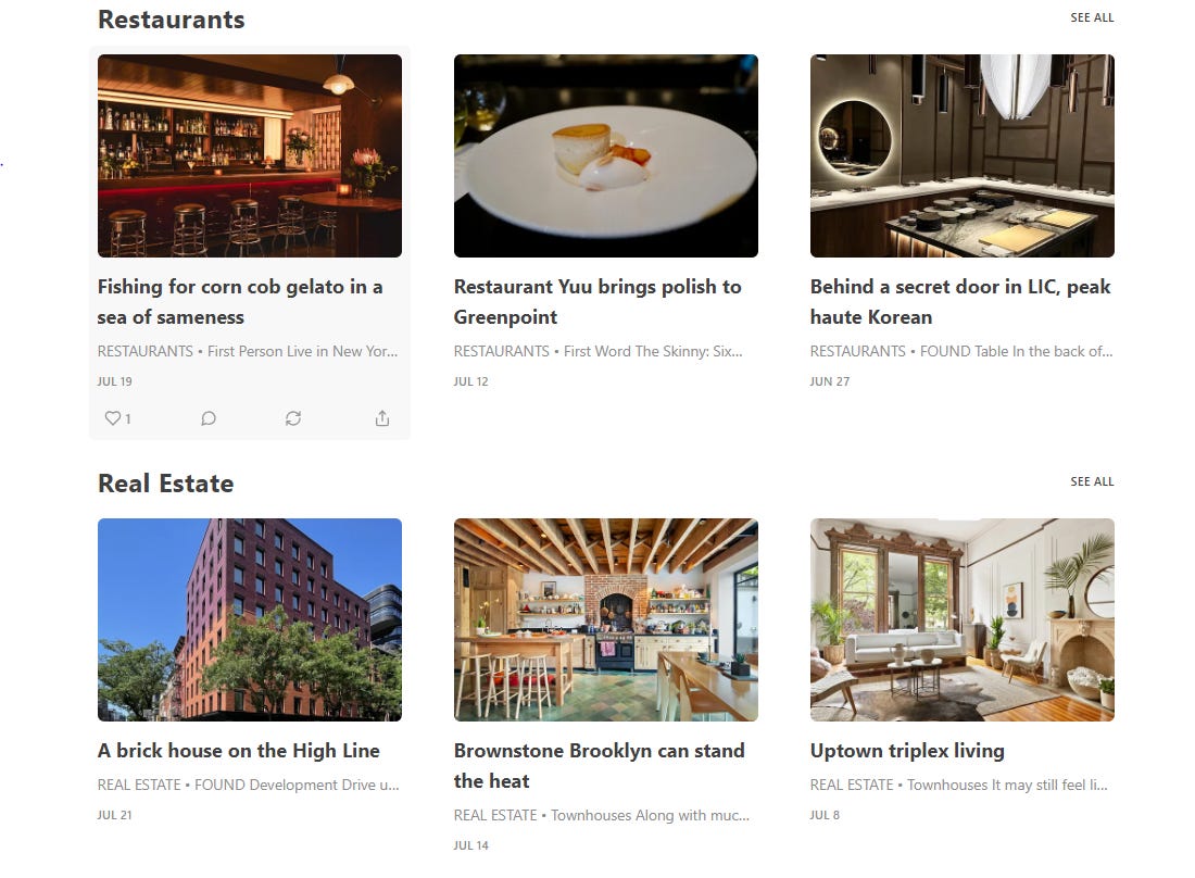 Found NY는 뉴욕시 내에서 방문할만한 식당, 집, 카페 등의 장소들을 리뷰하고 선정하여 보내주는 서비스다. Substack에서 팔리는 컨텐츠의 반경을 장소 큐레이션의 영역까지 확장시킨 예시.